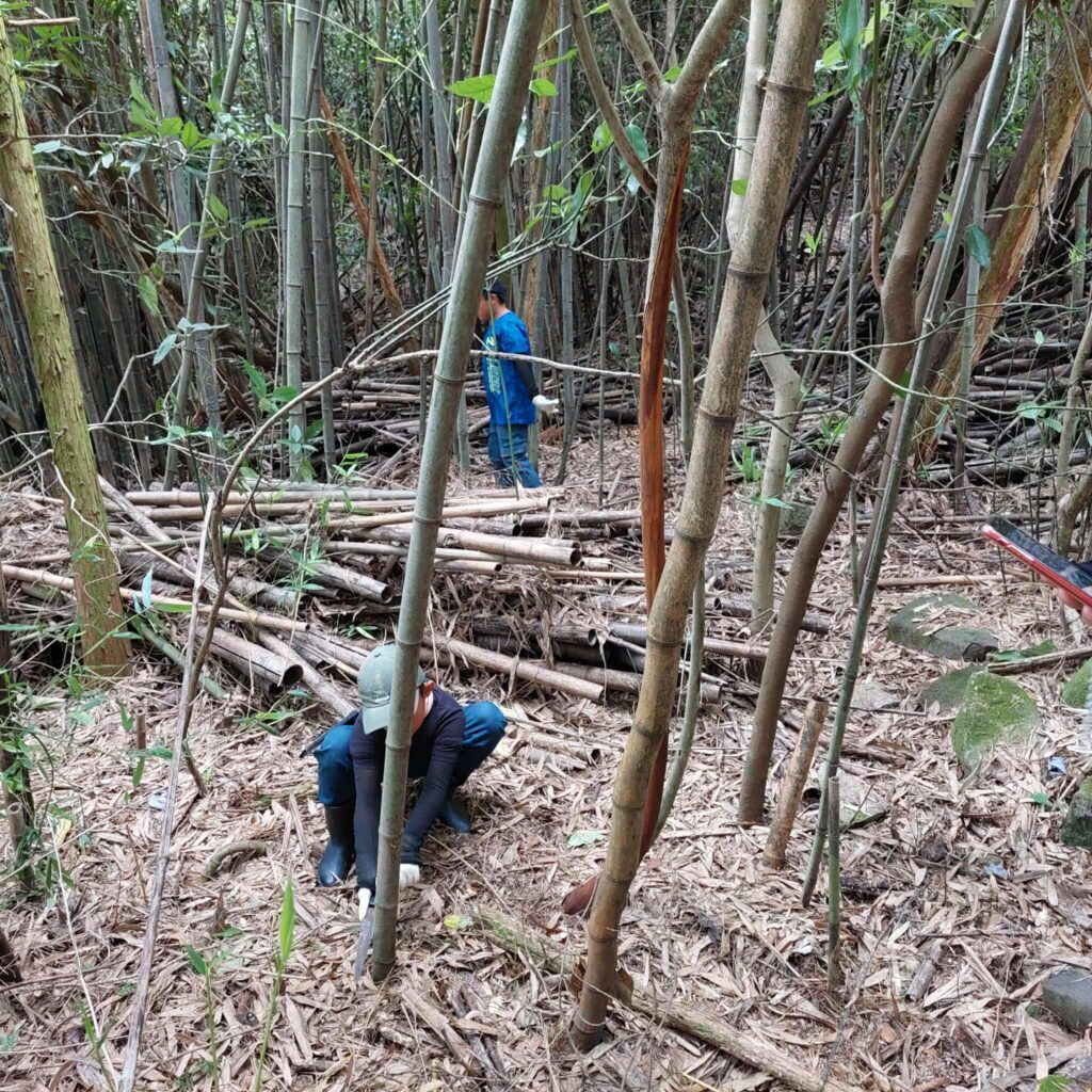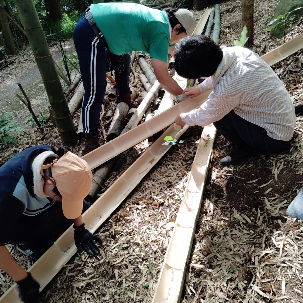 竹山で切り出した新鮮な竹を使って、スタッフが竹樋を製作。