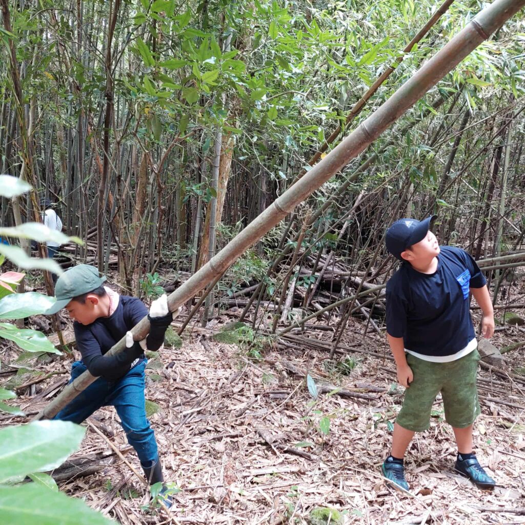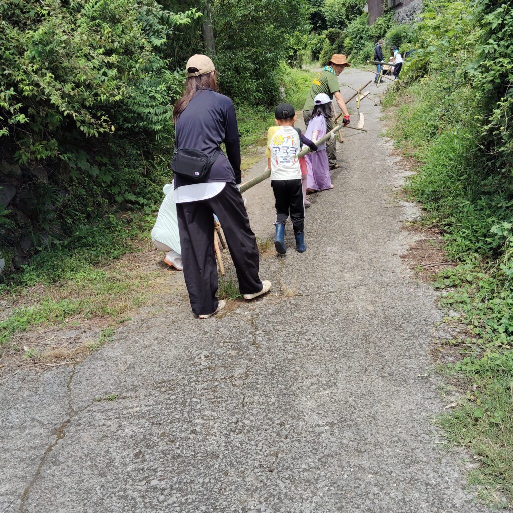 当日は、小さな園児たちがその竹を一生懸命運び、大きな小学生たちは、竹を輪切りにしてめんつゆ用の器作りに大活躍!