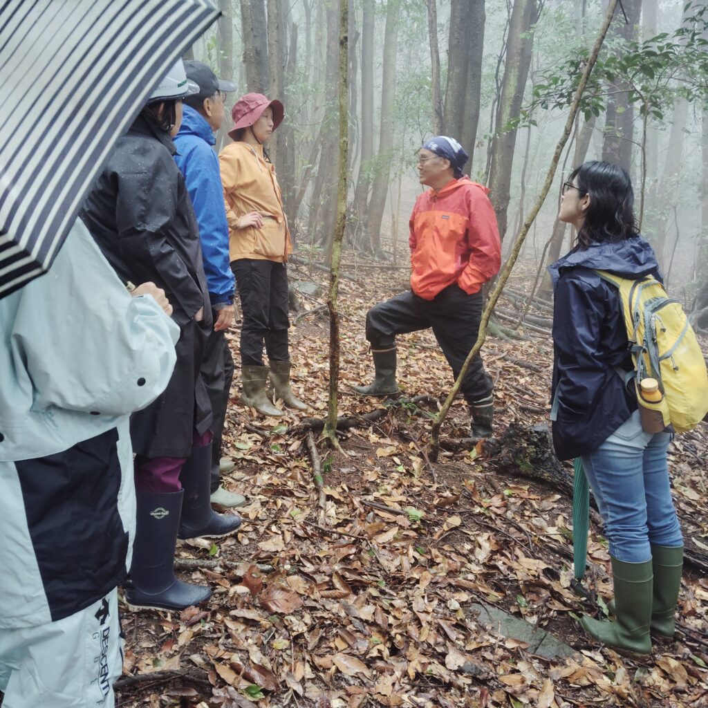 当日はあいにくの雨でしたが、参加者25名(講師含む)が雨具や傘を手に、しっとりとした森の中を歩きました。